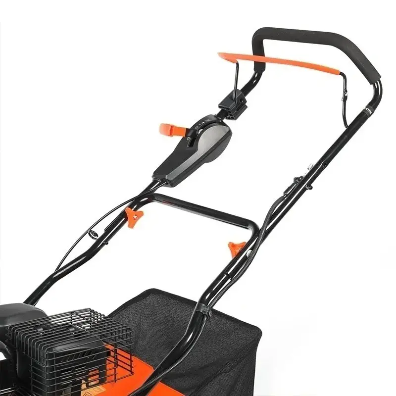 Объем травосборника рассчитан на 45 л. Это способствует редким прерываниям работы для его опустошения. При снятии травосборника вся растительность будет выбрасываться на землю.