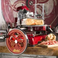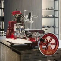 Слайсер Berkel Flywheel (Volano) B3 красный на подставке предназначен для нарезки мяса, сыра, колбасных изделий и других продуктов питания на ровные и равные ломтики на предприятиях общественного питания и торговли.