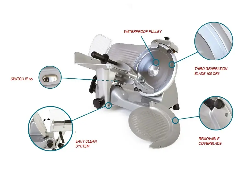 Слайсер Rgv LUXURY 300 G-ES WATER PRO предназначен для использования на предприятиях общественного питания, торговли, а также в производственных цехах, деятельность которых связана с выпуском гастрономических товаров, для нарезки мяса, сыра, колбасных изделий и других продуктов питания на ровные и равные ломтики.