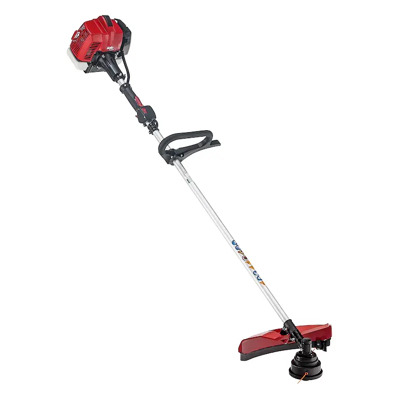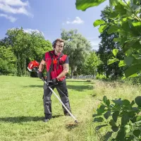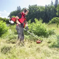 Бензиновый двигатель агрегата запускается ручным стартером. Электронная система управления зажиганием упрощает процесс запуска мотора и делает его работу эффективнее. В качестве режущего инструмента используется леска или многолопастной, стальной нож. С их помощью можно косить не только траву, но и бурьян, удалять молодую поросль кустарника. Стальной кожух, установленный вокруг триммерной головки, защищает оператора от разлетающегося мусора. Удобная ручка велосипедного типа регулируется. Ранцевый ремень даст возможность разгрузить руки пользователя и равномерно распределить вес прибора по всему телу.