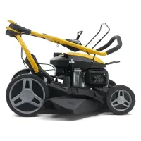 Скорость бензиновой газонокосилки регулируется с помощью вариатора. Вы можете подобрать комфортный для себя темп перемещения. Управление осуществляется двумя прижимными рычагами, отвечающими за привод на задние колеса и режущий механизм. При отпускании рукоятки машина останавливается, а вращение ножа прекращается.