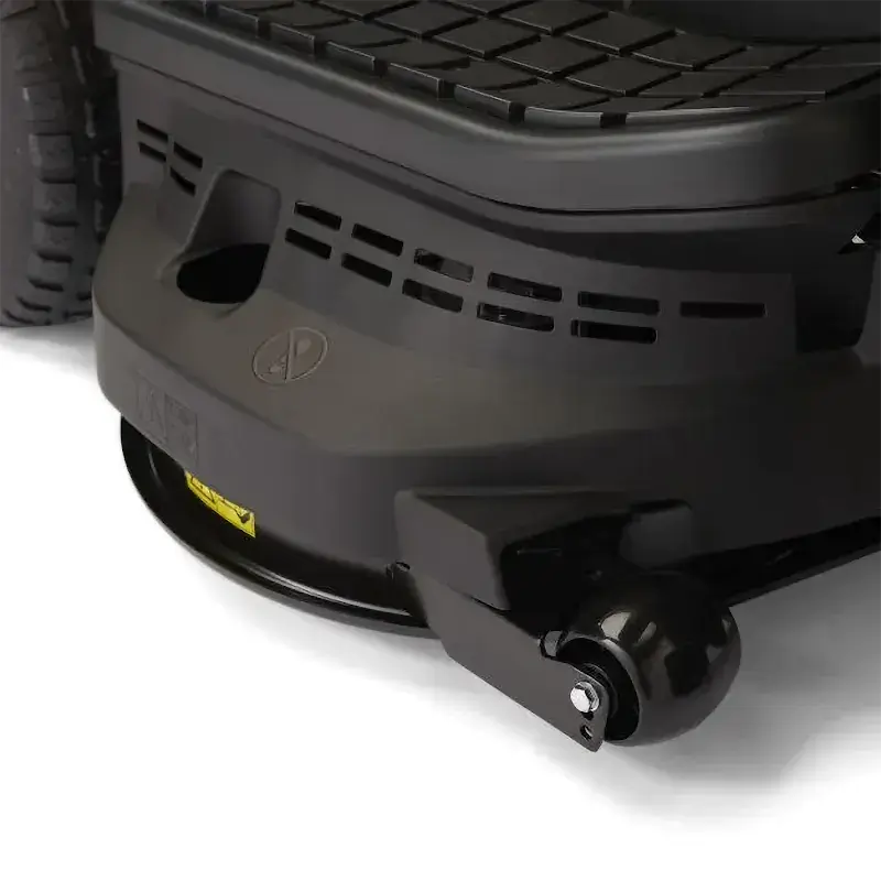 Передковые колеса предотвращают повреждение дерна, не позволяя углам деки оставлять в нем борозды при повороте на неровной поверхности, а штуцер для подсоединения шланга обеспечивает простое и быстрое удаление коррозионно-опасного мусора из нижней части деки.
