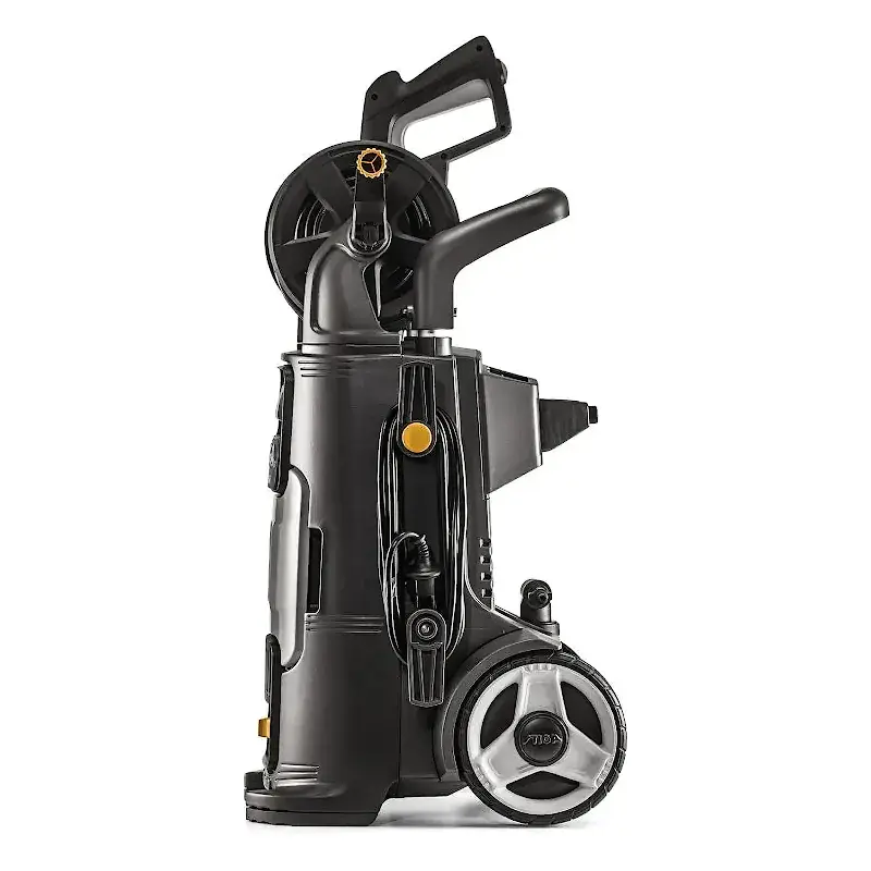 Дополнительные принадлежности хранятся в отдельном отсеке, поэтому не потеряются и будут всегда у вас под рукой. Для компактного хранения мойки предусмотрена катушка для намотки шланга высокого давления. С помощью ручки вы сможете быстро размотать шланг.