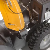 Благодаря экономичному двигателю и вместительному баку одной заправки хватает на продолжительную работу. Все элементы для управления движением, включения освещения, настройки дальности и направления выброса снега удобно расположены под руками. Прижимные рычаги привода шнека и колес можно зафиксировать в нажатом состоянии для удобства использования переключателей на панели оператора. Яркое освещение и подогрев рукояток обеспечивают дополнительный комфорт во время работы.