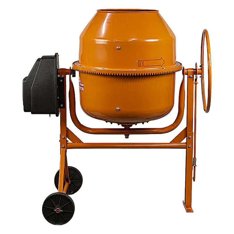 Бетономешалка обеспечивает быстрое приготовление смеси в течение 2 минут после загрузки всех компонентов. Емкость можно установить в удобном положении для хранения, перемешивания, загрузки или выгрузки. Ножная педаль фиксации барабана позволяет удерживать поворотное колесо двумя руками. Прочные транспортировочные колеса облегчают перемещение бетоносмесителя. Устройство рассчитано на замес большого объема и непрерывную работу в течение 45 минут в цикличном режиме.