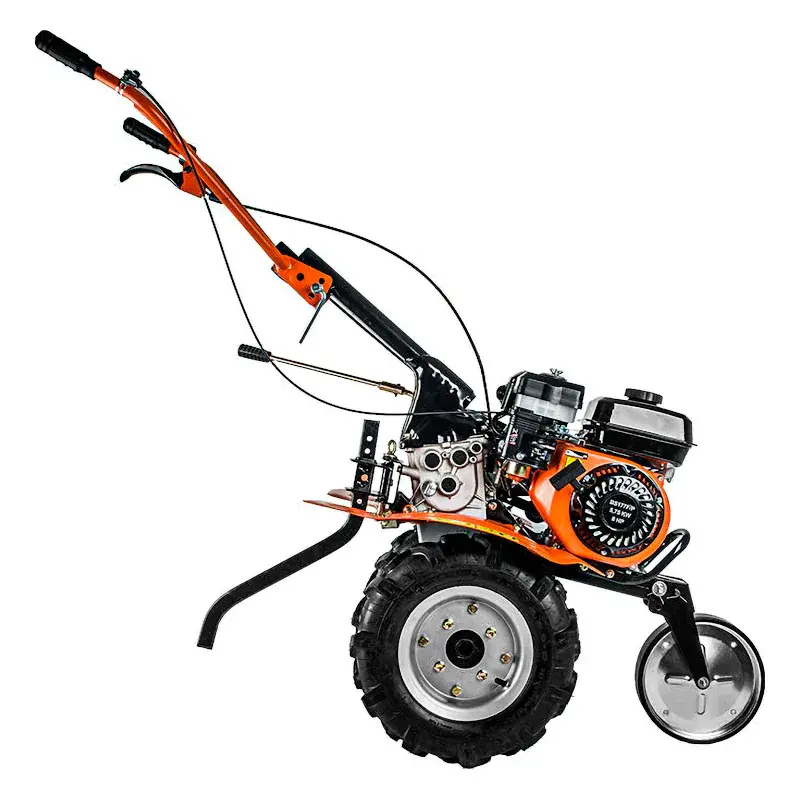 Система легкого старта обеспечивает бесперебойный запуск двигателя без особых усилий. Наборные рабочие фрезы выполнены из легированной стали и отличаются легкостью и хорошей прочностью. Быстрая и удобная настройка глубины обработки почвы облегчает работу на полях с изменяющимся рельефом.