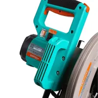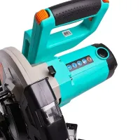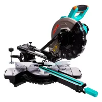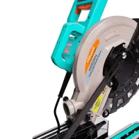 Сетевая торцовочная пила позволяет выполнять резы под углом в двух плоскостях благодаря возможности поворота рабочего стола вправо-влево и наклона пильного диска. Переключение между двумя режимами скорости оборотов для распила металла и дерева осуществляется при помощи кнопки на рукояти. Настройка угла и глубины реза выполняется при помощи регулировочных винтов, без использования специальных инструментов. Благодаря механизму протяжки возможен пропил заготовок шириной до 340 мм. Кнопка блокировки вала шпинделя облегчает смену пильных дисков.