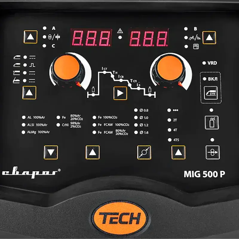 Инверторный полуавтомат Сварог TECH MIG 500 P (N36801) — это универсальная промышленная сварочная система, которая подходит для сварки MIG/MAG, DC TIG и MMA, а также строжки. Аппарат позволяет сваривать низкоуглеродистые, нержавеющие, разнородные стали, а также алюминий и его сплавы. Способом сварки TIG Lift можно дополнительно работать с медными, бронзовыми, латунными, титаном, высокоуглеродистыми сталями и сплавами (кроме алюминия и его сплавов).