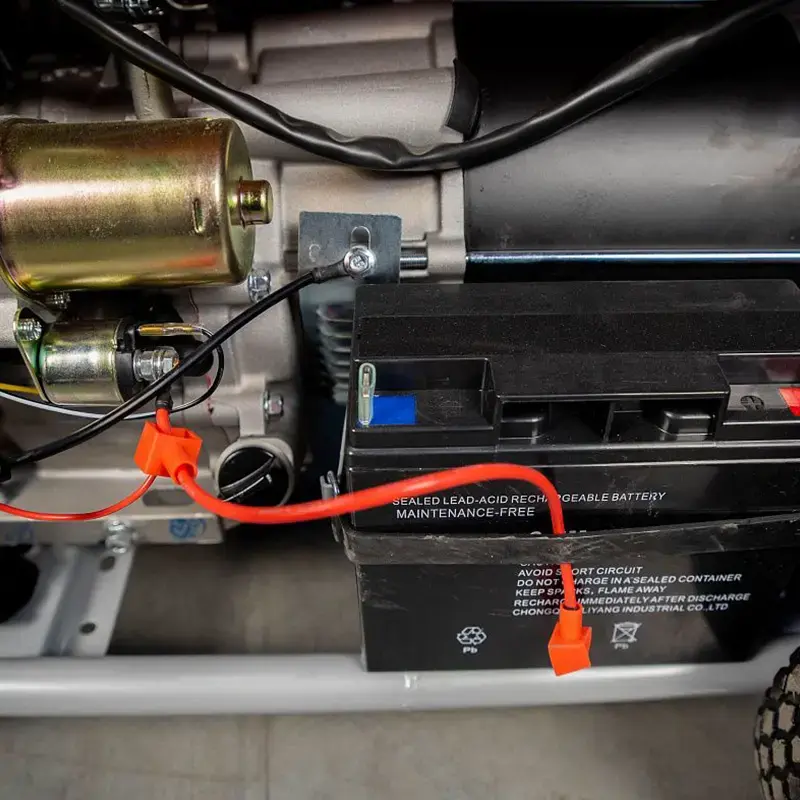 Синхронный альтернатор с медной намоткой позволяет вырабатывать чистый ток и выдерживать высокие нагрузки в момент запуска потребителей с электродвигателем. Кнопка запуска с электростартером облегчает процесс запуска генератора. Все рабочие механизмы прочно закреплены на массивной металлической раме.