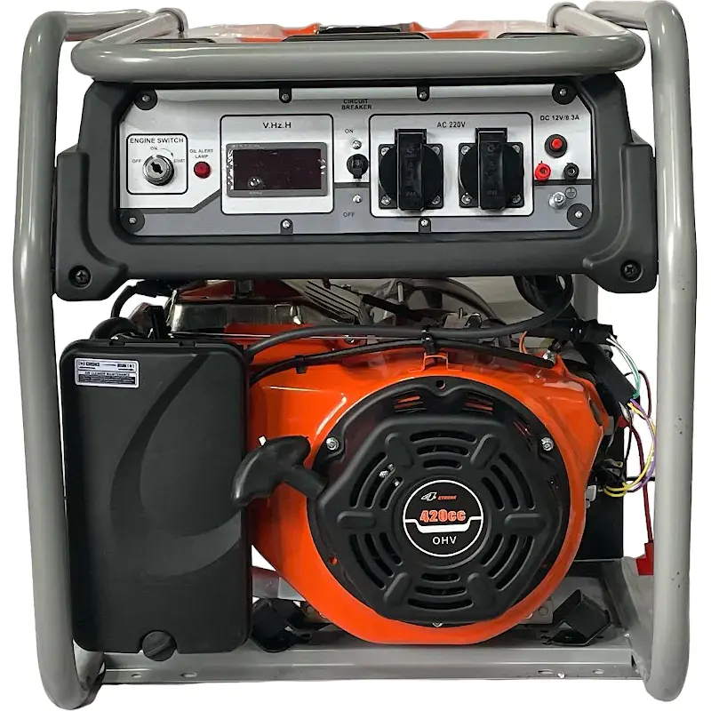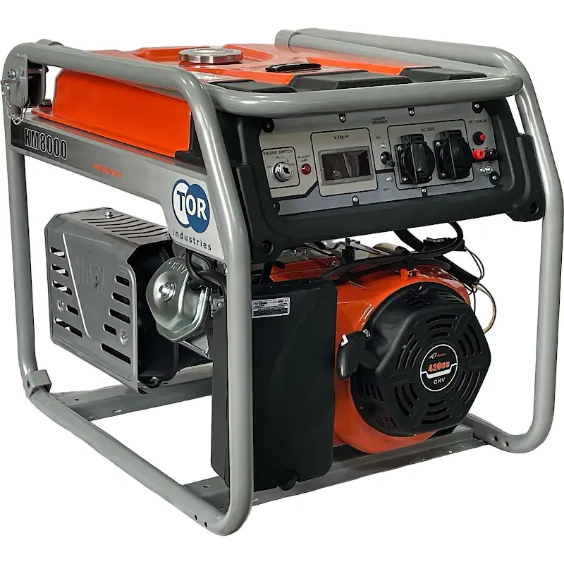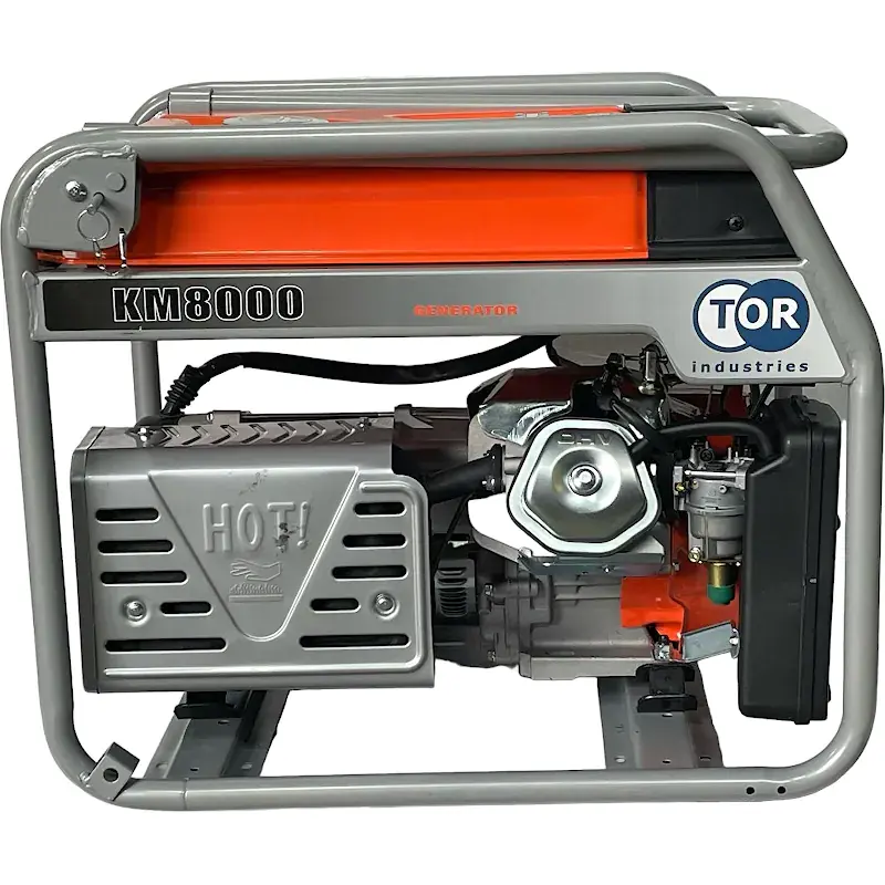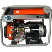 Генератор бензиновый TOR KM8000H 6,0 кВт 220В 27 л с кнопкой запуска и колесами эта мощная модель может снабжать электроэнергией несколько потребителей одновременно либо одного, но с высокими пусковыми токами. Рекомендуется для электроснабжения дома, небольшого учреждения, офиса, магазина, производства. Вместительный бак на 27 литров бензина обеспечит беспрерывную работу на протяжении 9 часов. Синхронный альтернатор с медной намоткой позволяет вырабатывать чистый ток и выдерживать высокие нагрузки в момент запуска потребителей с электродвигателем. Кнопка запуска с электростартером облегчает процесс запуска генератора. Все рабочие механизмы прочно закреплены на массивной металлической раме. Наличие колес в комплекте помогает транспортировать генератор без особых усилий.