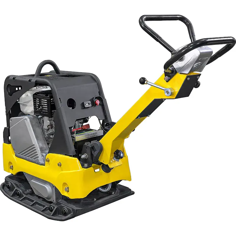 Литая подошва размером 860х585 мм, выполненная из высокопрочного чугуна, обеспечивает хорошее сцепление с поверхностью. В комплект поставки входят расширительные пластины для увеличения площади трамбовки и повышения производительности. Положение рукоятки можно регулировать для удобства управления. Верхний крюк предназначен для подъема и переноски строительным краном.