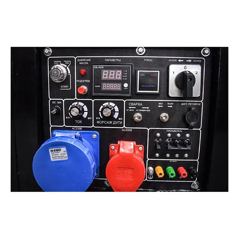 • Многофункциональный Дисплей отображает все основные параметры работы генератора: Силу Тока, Нагрузку, Напряжение, Частоту Тока, и Отработанные Мото-часы для своевременного технического обслуживания.