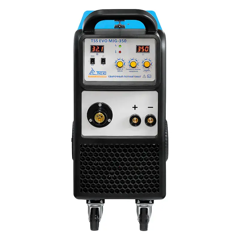 Сварочный полуавтомат ТСС EVO MIG-350 – промышленный аппарат, который поддерживает режимы ММА и MIG/MAG, выдает максимальным сварочный ток 350 А. Для простого перемещения по площадке данная модель оснащена транспортировочной тележкой с колесами и рукояткой.