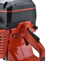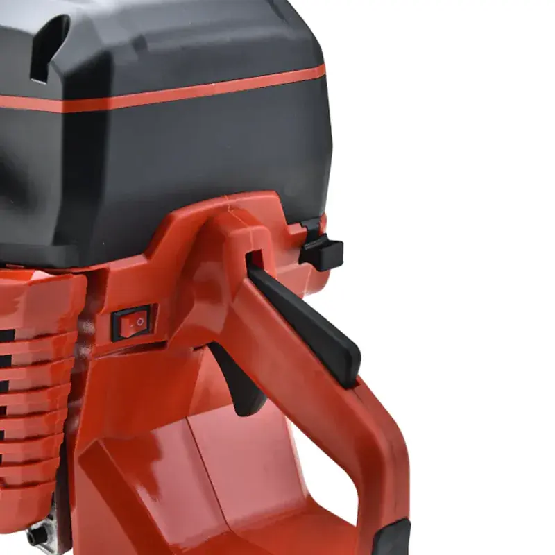 Клавиша блокировки спускового курка предохраняет от случайного включения инструмента. Металлический кожух защищает от искр и пыли, вылетающих из-под пильного диска. Выключатель зажигания, удобно расположенный на рукоятке, позволяет мгновенно заглушить двигатель в экстренном случае.