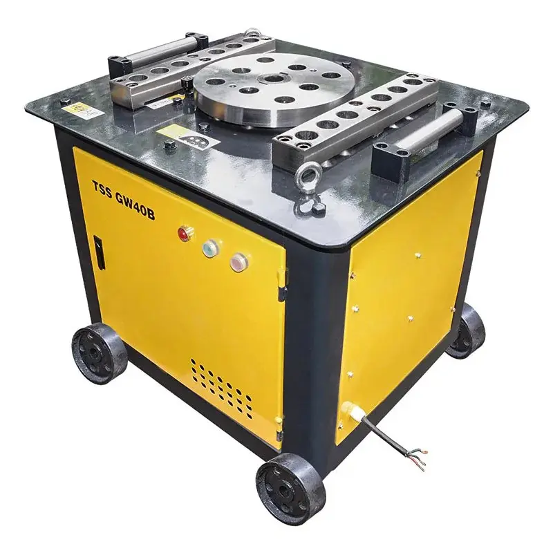 Станок для гибки арматуры ТСС GW 40B оснащен двигателем мощностью 3 кВт и справляется со стальными изделиями диаметром от 6 до 32 мм. Для простого перемещения по рабочему помещению есть 4 транспортировочных колеса.