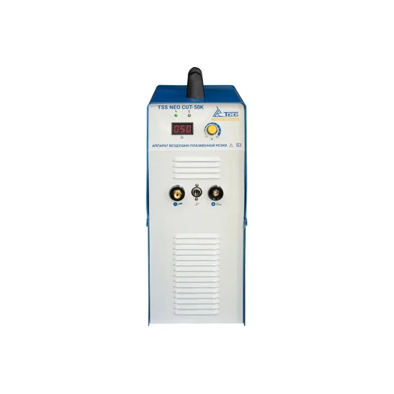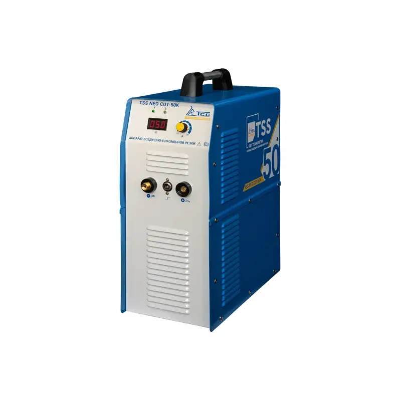 Аппарат воздушно-плазменной резки ТСС NEO CUT-50K работает от однофазной сети 220 В. Благодаря встроенному компрессору с расходом воздуха 170–200 л/мин вы сможете сразу же приступить к работе после включения питания и выбора тока резки в диапазоне 15–50 А. Инверторный преобразователь обеспечивает стабильное напряжение и отличные результаты резки без деформации краев. Прибор максимальной мощностью 7 кВт рассчитан на крой токопроводящих материалов толщиной до 15 мм. Зажигание дуги выполняется контактным способом.