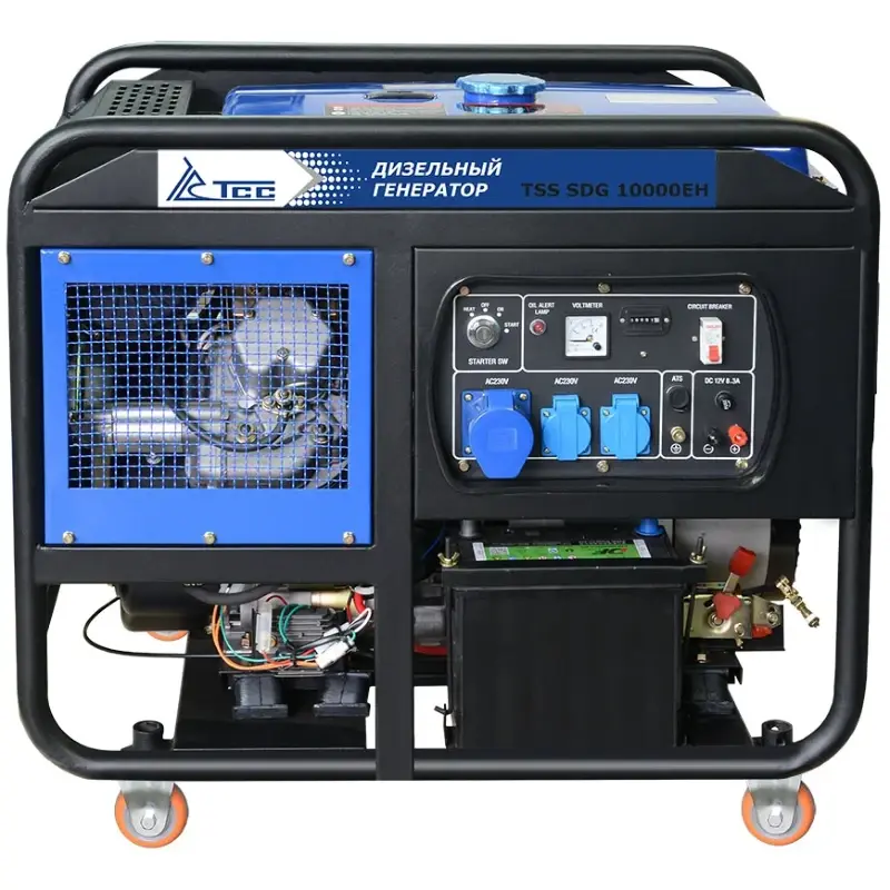 Дизель генератор TSS SDG 10000 EH предназначен для выработки электроэнергии с основными характеристиками: напряжение 220 вольт, частота 50 Гц и номинальной мощностью 10 кВт, оснащенный колесным комплектом для удобства передвижения.Дизель генератор с максимальной мощностью 11 кВт не только отлично справится с созданием резервного электропитания в случаях отключения электроэнергии, но и гарантирует стабильную работу в качестве главного источника питания. Применяется в качестве независимого источника электроэнергии в частном доме или на даче, на объектах малого строительства и уличной торговли, при подключении бытовых приборов и инструмента.