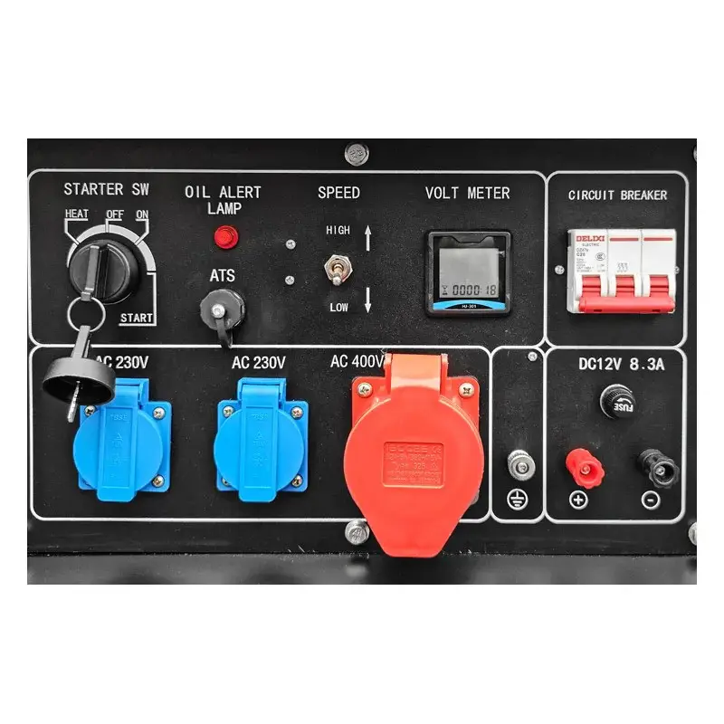 • Панель управления содержит вольтметр для отображения напряжения, счетчик моточасов, а также, индикатор уровня масла и индикатор топлива, автомат защиты