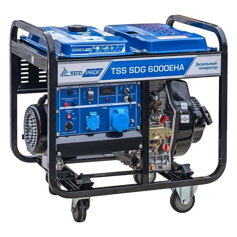 Дизельный генератор с электростартом и с разъемом для подключения блока автоматики. TSS SDG 6000EHА предназначен для выработки электроэнергии с основными характеристиками: напряжение - 220 вольт, частота 50 Гц и номинальной мощностью 6 кВт, оснащенный колесным комплектом для удобства передвижения.