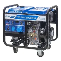 Дизельный генератор с электростартом и с разъемом для подключения блока автоматики. TSS SDG 6000EHА предназначен для выработки электроэнергии с основными характеристиками: напряжение - 220 вольт, частота 50 Гц и номинальной мощностью 6 кВт, оснащенный колесным комплектом для удобства передвижения.