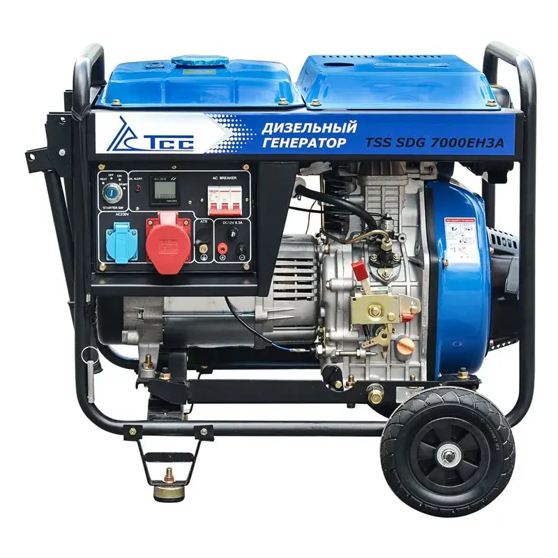 Дизельный генератор с электростартом TSS SDG 7000EH3A предназначен для выработки электроэнергии с основными характеристиками: напряжение -380/ 220 вольт, частота 50 Гц и номинальной мощностью 6.5 кВт, оснащенный колесным комплектом и ручкой, для удобства передвижения.