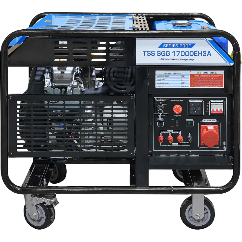 Генератор ТСС SGG 17000EH3A оборудован колесами для удобства перемещения. Прочная стальная рама защищает двигатель от механических внешних воздействий. Электрическая розетка снабжена крышкой, предохраняющей от влаги и пыли. Специально предусмотренные выходы на лицевой панели позволяют подключить блок ввода резерва для автоматического включения генератора при отсутствии напряжения в сети.