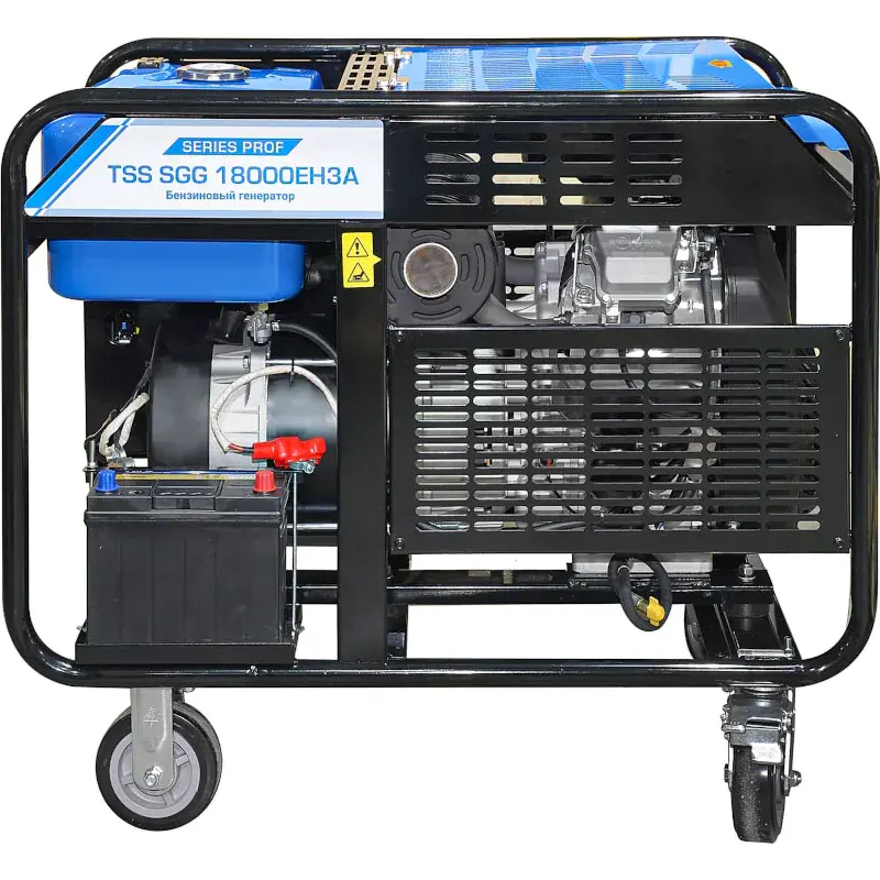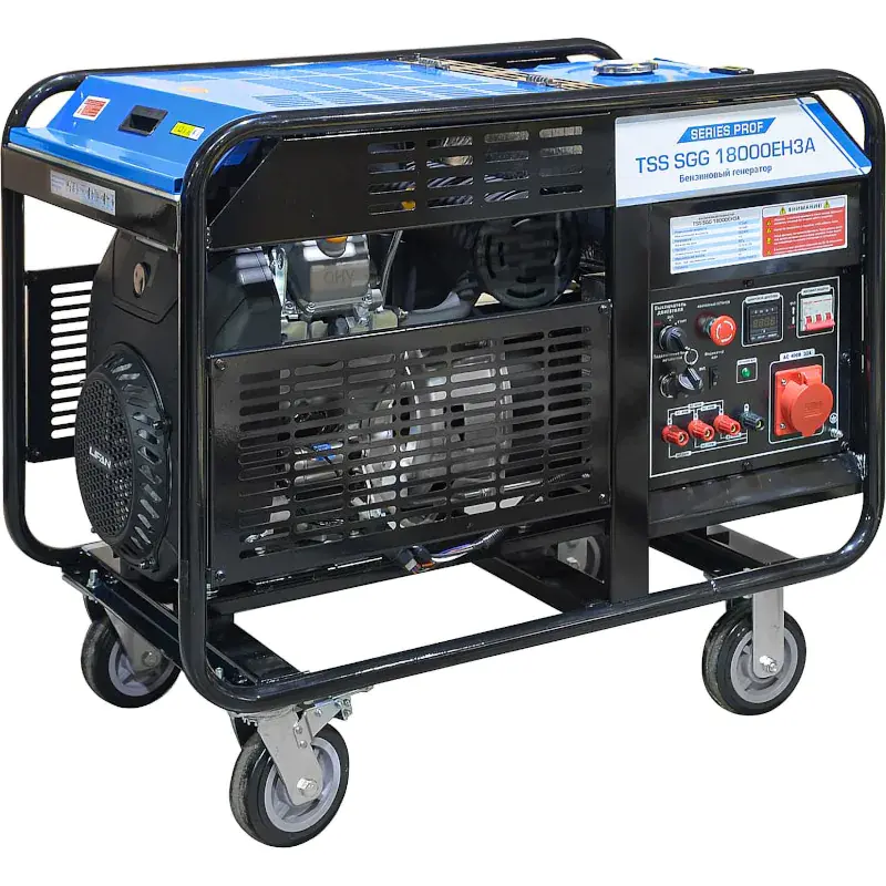 Генератор ТСС SGG 18000EH3A оборудован колесами для удобства перемещения. Прочная стальная рама защищает двигатель от механических внешних воздействий. Электрическая розетка снабжена крышкой, предохраняющей от влаги и пыли. Специально предусмотренные выходы на лицевой панели позволяют подключить блок ввода резерва для автоматического включения генератора при отсутствии напряжения в сети.