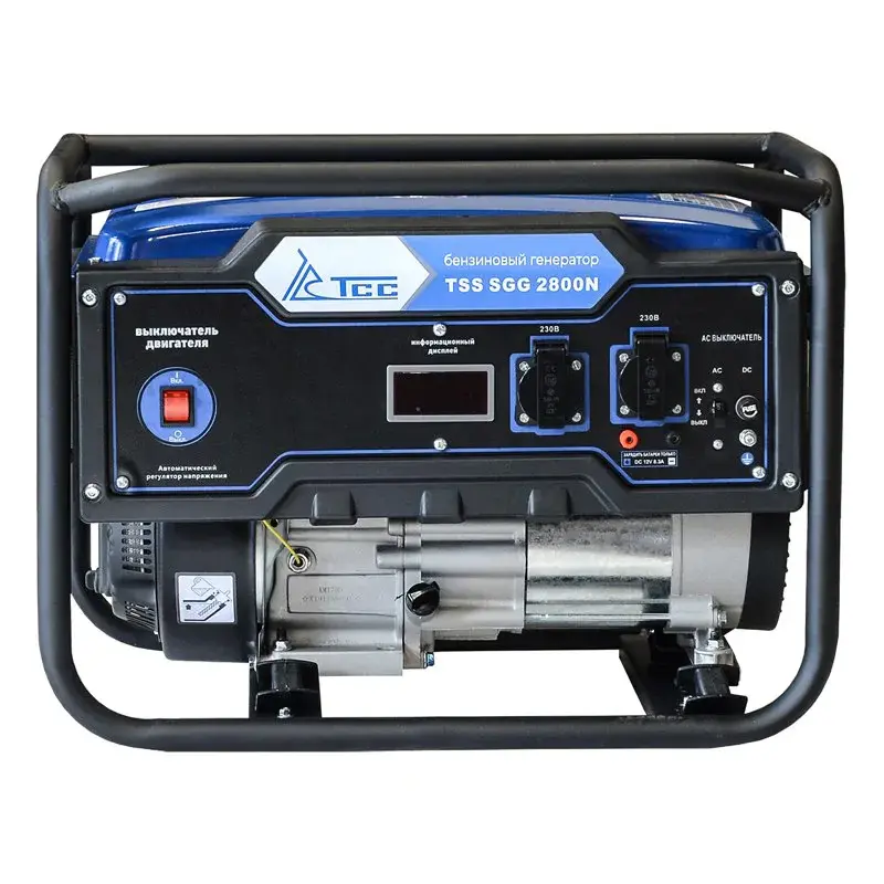 Электростанция TSS SGG 2800N имеет 2 розетки на 220 В. Рядом находится ЖК-экран, на котором вы сможете контролировать показатели моточасов, напряжения, а также частоты тока.