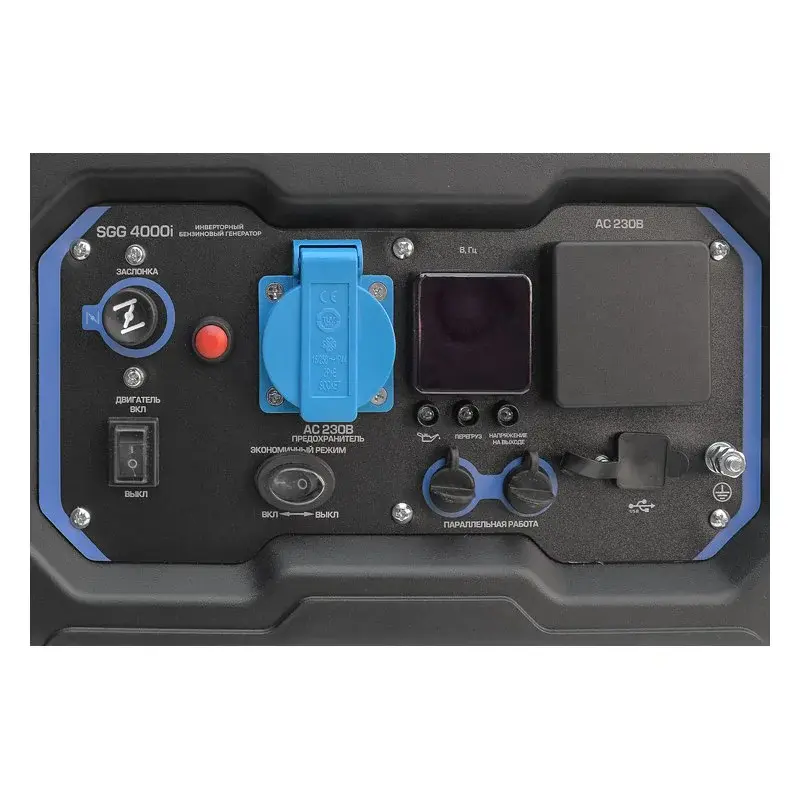 На панели управления инверторного генератора TSS SGG 4000i расположены индикаторы, сообщающие о текущем состоянии аппарата. Соответствующая лампочка загорается при высоком напряжении на выходе, недостаточном уровне масла в бачке или возникновении перегрузке. В каждом случае срабатывает система защиты, останавливающая работу модели. Это предотвращает раннюю поломку и продлевает срок службы оборудования.