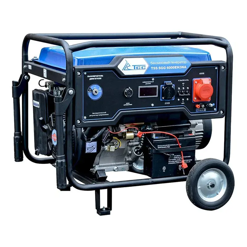 Бензогенератор TSS SGG 6000EH3NA с номинальной мощностью 6 кВт подходит как для питания однофазных, так и трехфазных потребителей. Транспортный комплект включает в себя колеса и складную ручку для удобного перемещения по рабочей площадке.