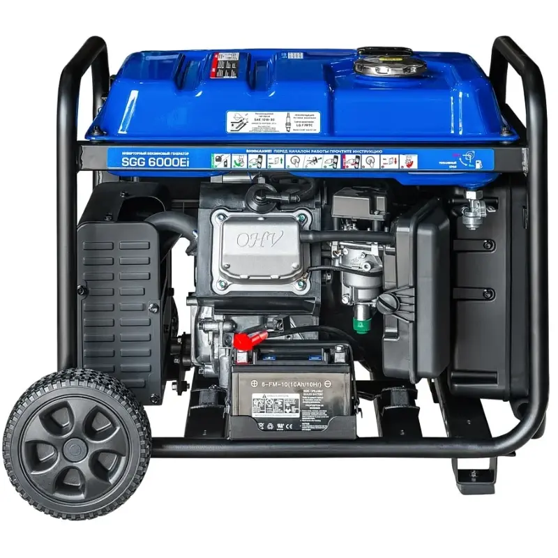 Бензогенератор инверторный SGG 6000Ei с электростартом, коннектором для подключения блока АВР(блок автоматического запуска генератора), укомплектован колесным комплектом для удобства перемещения. Бензиновый генератор предназначен для подключения к нему потребителей тока общей максимальной мощностью до 6,5 кВт. Позволяет напрямую подключать к генератору как обычных потребителей, так и точное электронное оборудование, например, ноутбуки, LCD-телевизоры или смартфон.
