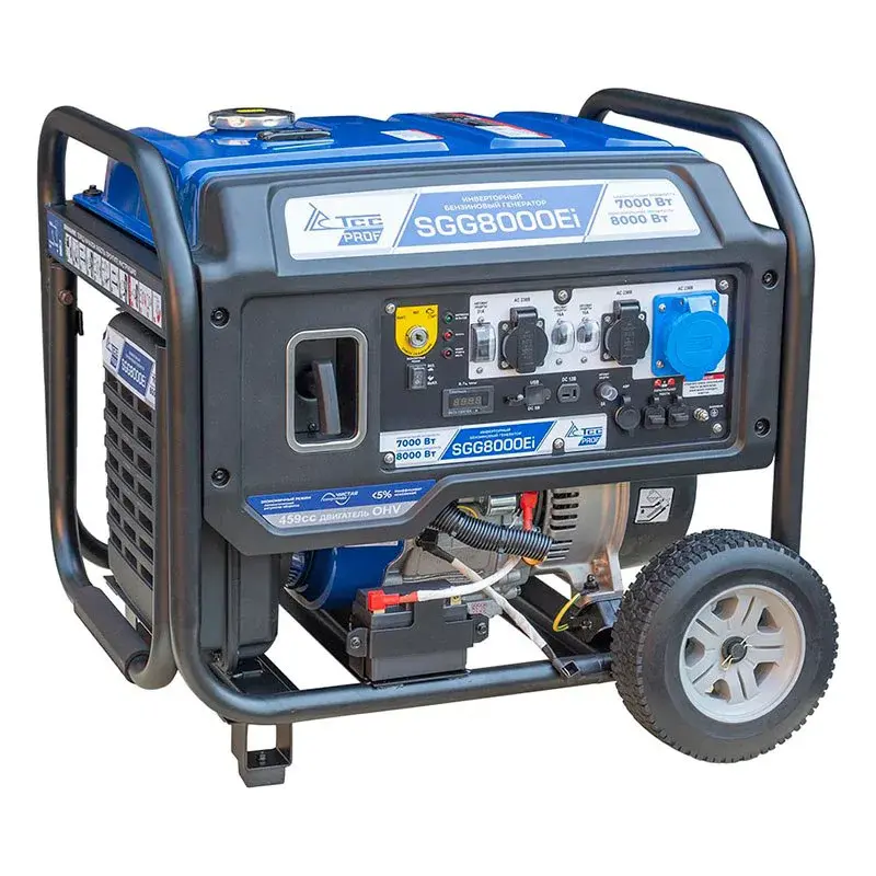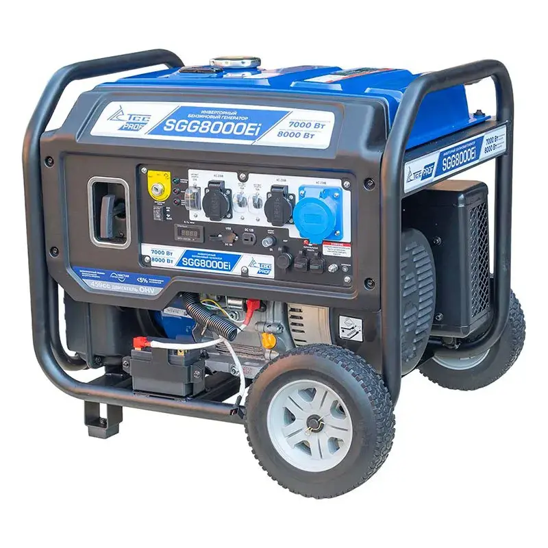 Инверторный бензогенератор ТСС SGG 8000Ei – аппарат для резервного или постоянного питания потребителей суммарной мощностью до 7 кВт. Для простого перемещения по рабочему помещению предусмотрены колеса.