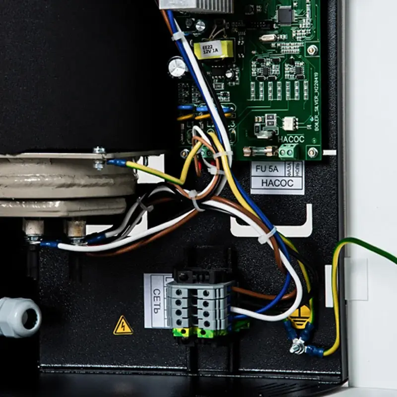 - SOS. В случае выхода из строя одного ТЭНа или симистора управления котёл продолжает работать на оставшихся ТЭНах, сигнализируя о проблеме.