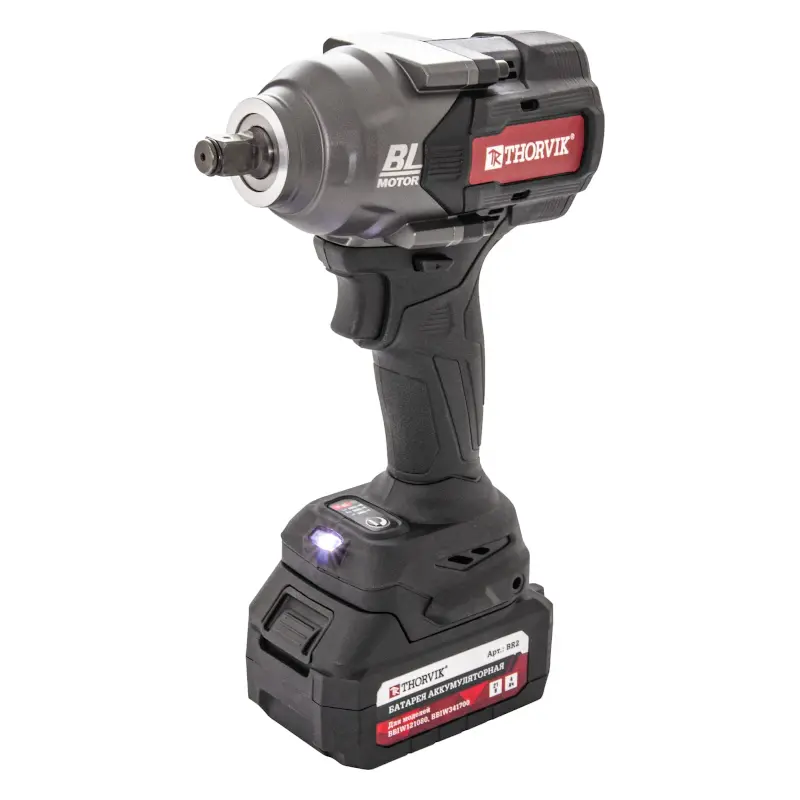 В аккумуляторном гайковерте Thorvik BBIW121080 предусмотрена отдельная клавиша для активации обратного вращения шпинделя. Реверс понадобится для выкручивания крепежа. Если вы работаете в темном помещении или тень перекрывает обзор, будет полезен встроенный светодиод.