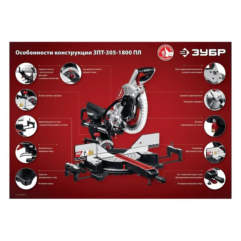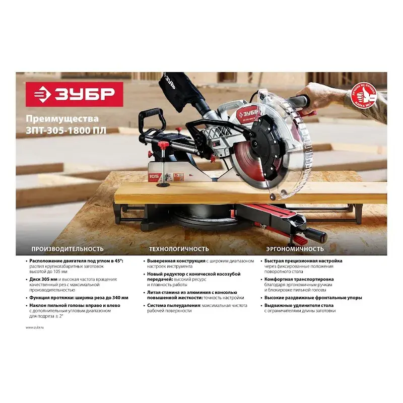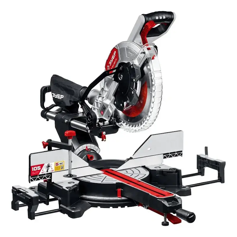 Торцовочная пила ЗУБР ЗПТ-305-1800 ПЛ с протяжкой оснащена двигателем на 1800 Вт, за счет чего оптимально подходит для реза дерева и пластика. В комплекте поставляется текстильный пылесборник для стружки из рабочей зоны.