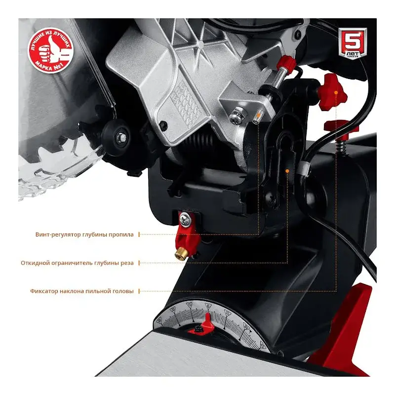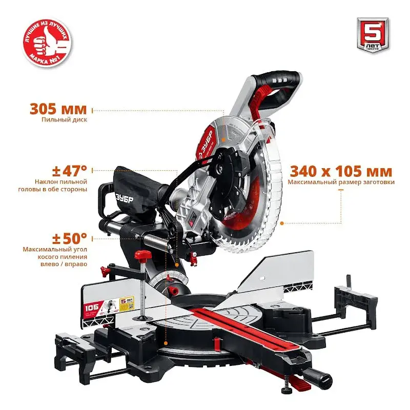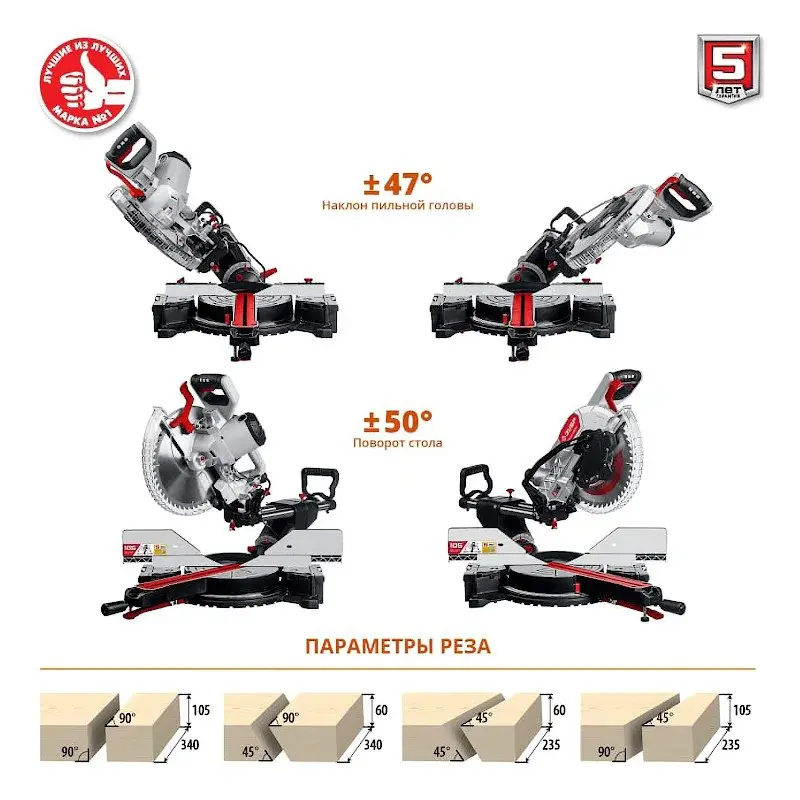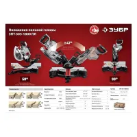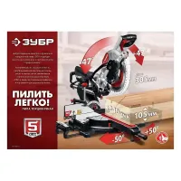 Стол торцовки поворачивается на 50° в каждую сторону и фиксируется зажимом. Это облегчает работу с большим числом однотипных изделий, например, если требуется установить плинтусы по всему дому. Фиксированные значения в 0°, 15°, 22,5°, 31,6° и 45° обеспечивают быструю установку стола. Диск торцевой пилы ЗУБР ЗПТ-305-1800 ПЛ наклоняется влево и вправо на 47° для косых пропилов.