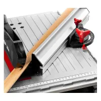 Дополнительная рабочая поверхность в верхней части корпуса оснащена регулируемой направляющей, которая также служит упором для заготовок. За счет этого можно распиливать длинные доски и бруски. Диск закрыт откидным пластиковым кожухом для безопасности.