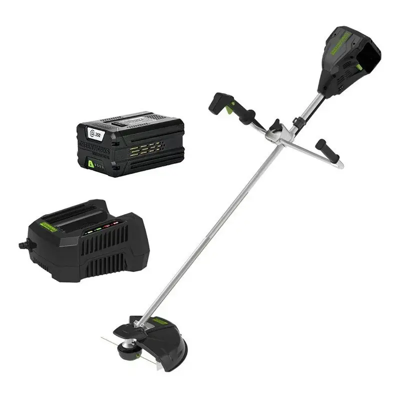 Триммер включается нажатием кнопки пуск. Время автономной работы при использовании батареи на 5 Ач составляет 1,5 часа, а в случае использования аккумуляторного ранца Гринворкс 82V на 12,5 Ач — до 3,5 часов. Триммер оснащается множеством защитных функций: защита от случайного включения, защита двигателя от перегрузок, оснащается защитным кожухом режущей части. Вал между двигателем и редуктором — прямой и сделан из специальной легкой стали. Для смазки редуктора предусмотрен специальное отверстие. Устройство входит в линейку аккумуляторного инструмента 82V Commercial и станет отличным дополнением к вашему набору устройств 82 Вольта.
