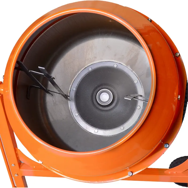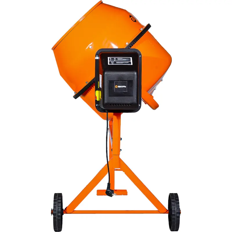 Приготовление смеси в бетономешалке занимает от 2 до 5 минут. С помощью поворотного колеса барабан можно установить в несколько рекомендуемых положений: для перемешивания, частичной или полной выгрузки и хранения. Простое управление осуществляется при помощи двух кнопок: зеленой, используемой для включения, и красной — для выключения. Устройство легко перемещать по участку благодаря большим колесам на опорной раме.