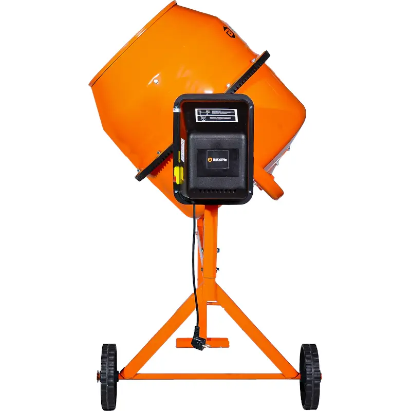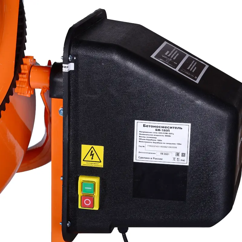 Бетономешалка работает от однофазной сети переменного тока напряжением 230 В. Электродвигатель мощностью 800 Вт обеспечивает вращение барабана со скоростью до 32 об/мин.