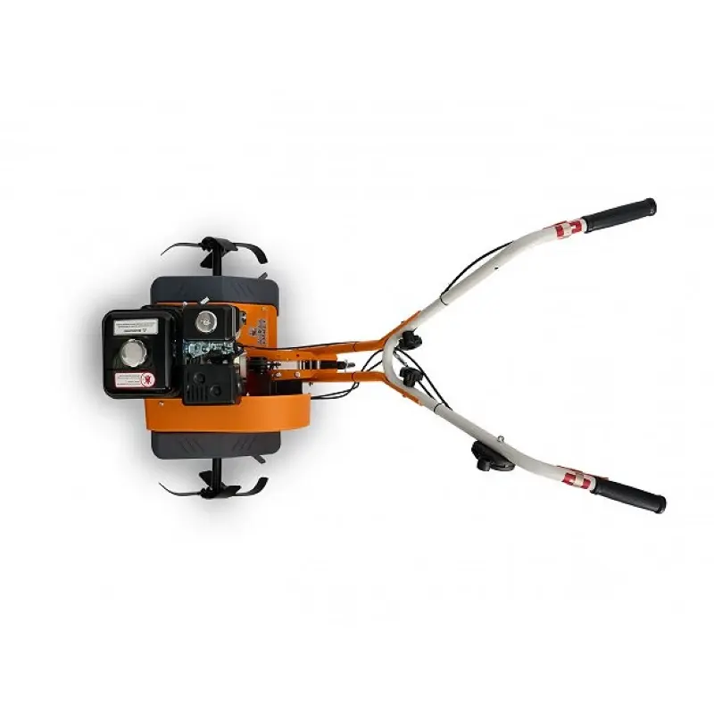 На рукоятке расположены органы управления, а рукоятка складная для удобства транспортировки и хранения. Кожух увеличенного размера, закрывающий приводной механизм ремней, предохраняет от попадания земли во время работы.