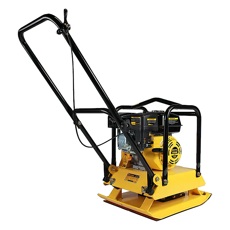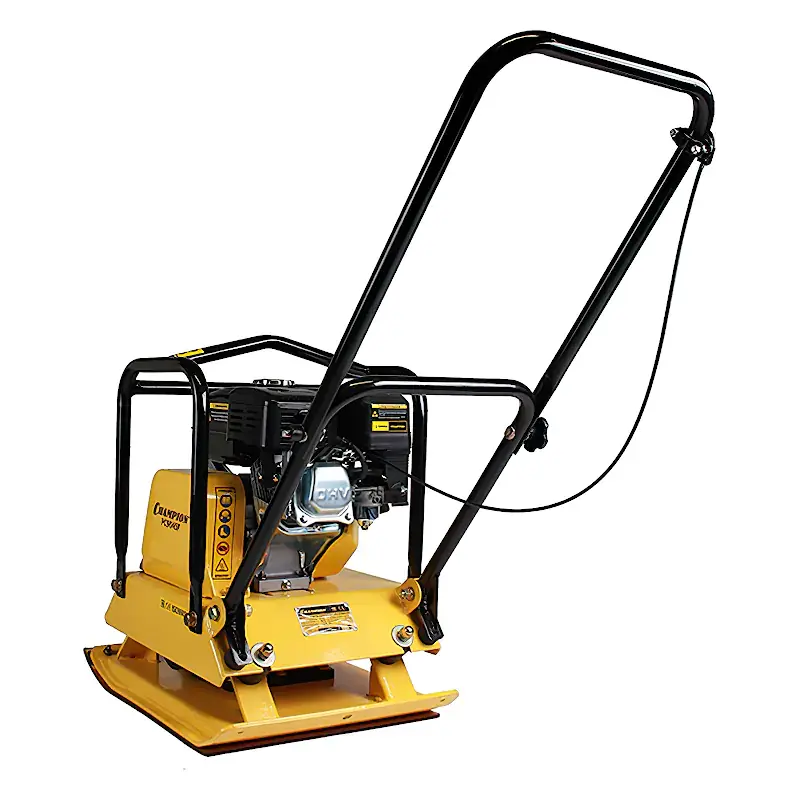 Бензиновая виброплита CHAMPION PC9045F предназначена для уплотнения песка, гравия, битумногравийной смеси, каменной брусчатки при строительстве и ремонте дорог и тротуаров, автомобильных стоянок, площадей, спортплощадок, фундаментов, инженерных сетей и других строительных работах. Виброплита PC9045F оснащена фирменным 4-тактным одноцилиндровым двигателем CHAMPION мощностью 6.5 л.с. Запуск двигателя производится ручным стартером. Объем топливного бака составляет 3.6 л, который рекомендуется заправлять бензином не ниже АИ-92. Контроль уровня масла в картере, объем которого 0.6 л осуществляется с помощью датчика. При недостаточном уровне масла двигатель не запустится. Бензиновая вибрационная плита CHAMPION PC9045F рассчитана на работу двигателя при 3600 об/мин. Работа двигателя на более низких оборотах приведет к снижению силы уплотнения, скорости движения и маневренности. Высокий уровень мощности и размеры плиты (50х45 см), обеспечивают эффективность на больших участках, средняя производительность виброплиты PC9045F составляет 660 м2/час. Эта модель виброплиты обеспечивает уплотнение основания на глубину до 300 мм за один проход. Выполняя работы по уплотнению материалов дорожного покрытия из тротуарной плитки, брусчатки, плитняка установите резиновый коврик на плиту, что предотвратит повреждение поверхности. Для продления срока службы резинового коврика не рекомендуется использовать его при уплотнении песка, гравия, битумно-гравийной смеси. Максимальный угол наклона при работе на склонах не должен превышать 15°. Для перемещения виброплиты CHAMPION PC9045F к новому участку работы на небольшое расстояние используйте транспортировочную тележку.