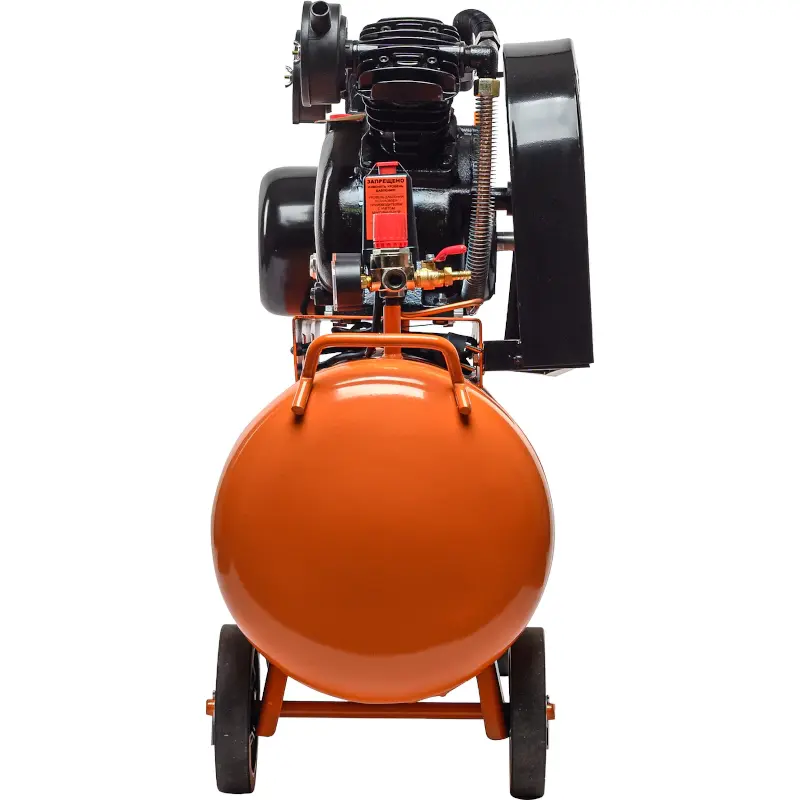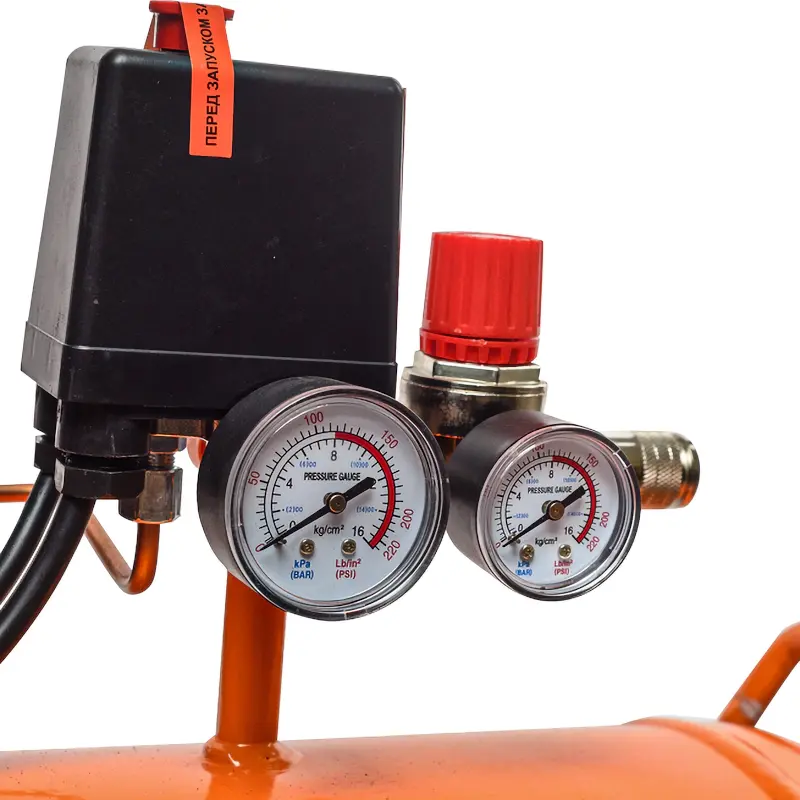 Регулятор давления позволяет вручную контролировать величину показателя. Это позволит подключать разнообразный пневматический инструмент, совместимый в рамках рабочего диапазона компрессора. Во время регулировки показатель удобно отслеживать по встроенному манометру.