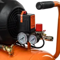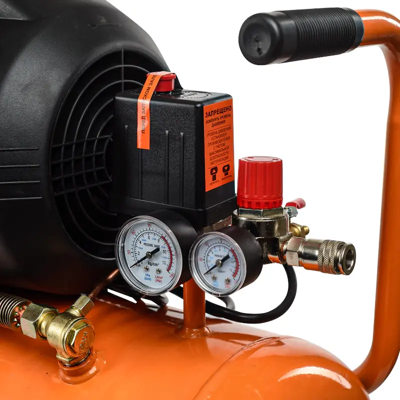 Электромеханический блок управления автоматически регулирует работу компрессора и поддерживает заданное давление в ресивере. В зависимости от подключенного потребителя сжатого воздуха вы можете менять выходное давление в пределах 1-12,5 атм. Рабочие параметры удобно отслеживать с помощью двух стрелочных манометров.