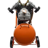 Быстросъемный штуцер и коннектор типа «елочка» с вентилем позволяют подсоединять к компрессору различное оборудование. Ресивер оснащен дренажным клапаном для слива конденсата. Рукоятка с противоскользящей накладкой и два колеса упрощают перемещение пневмокомпрессора. Резиновые наконечники на опорных ножках выполняют роль амортизаторов.