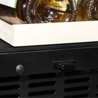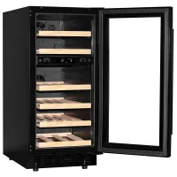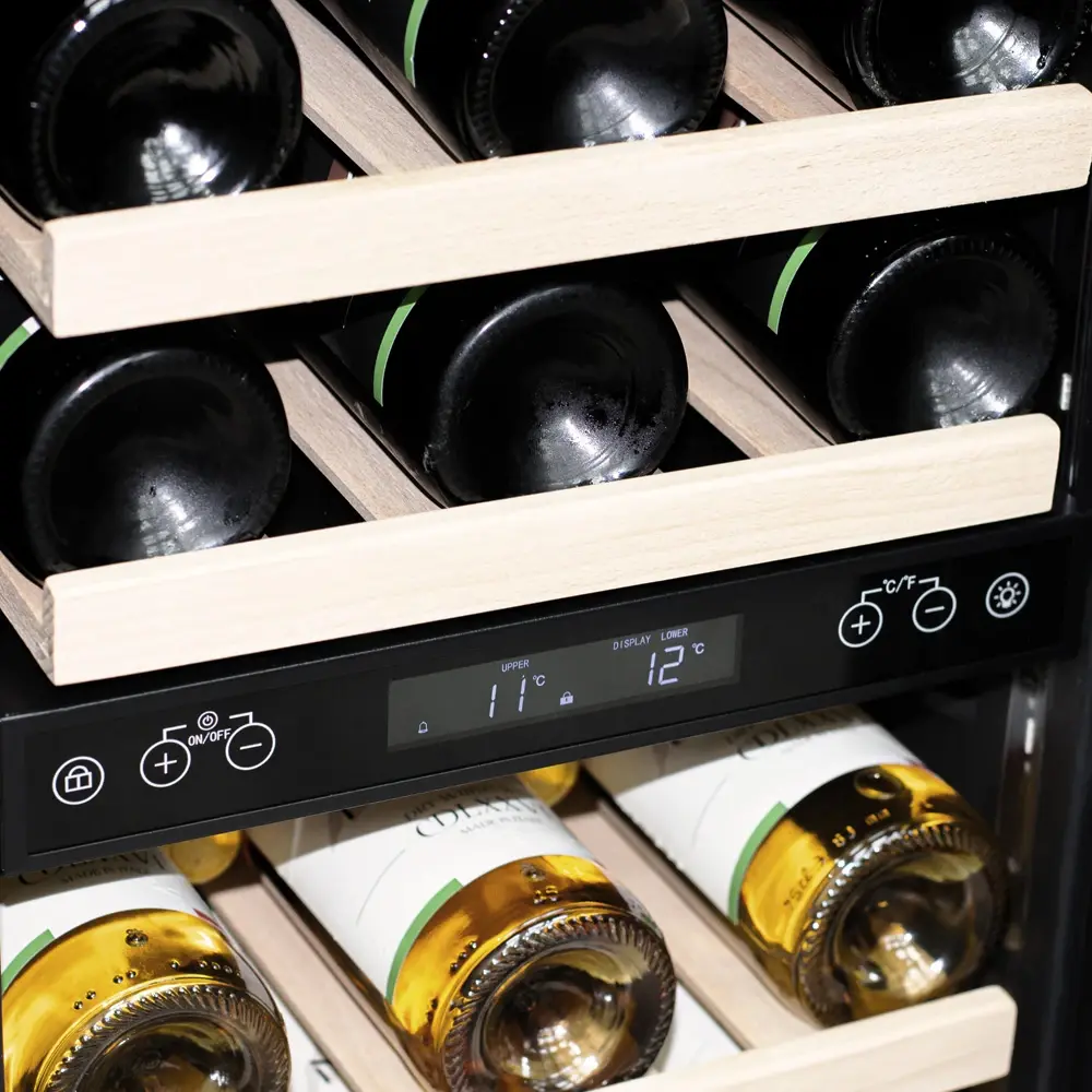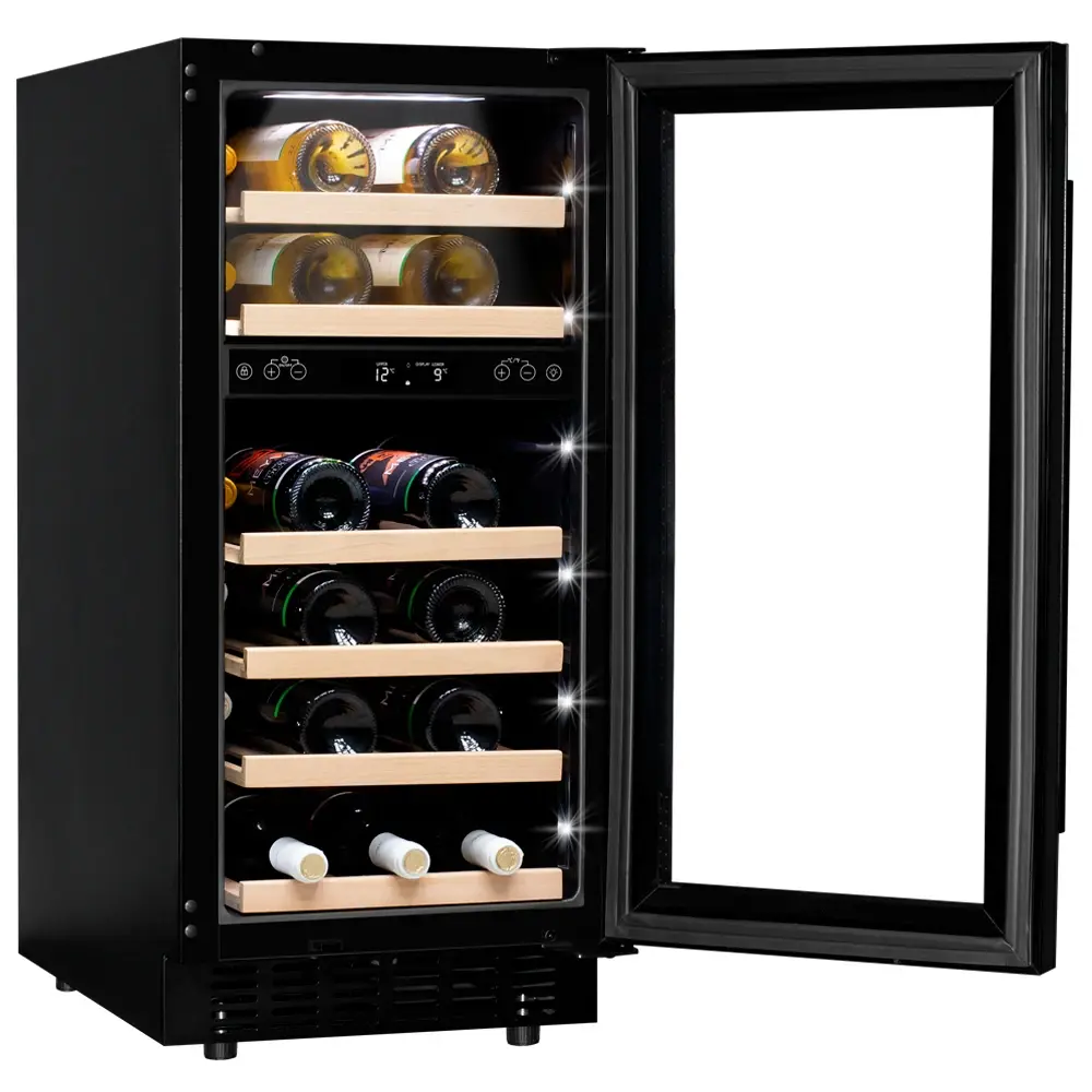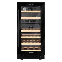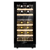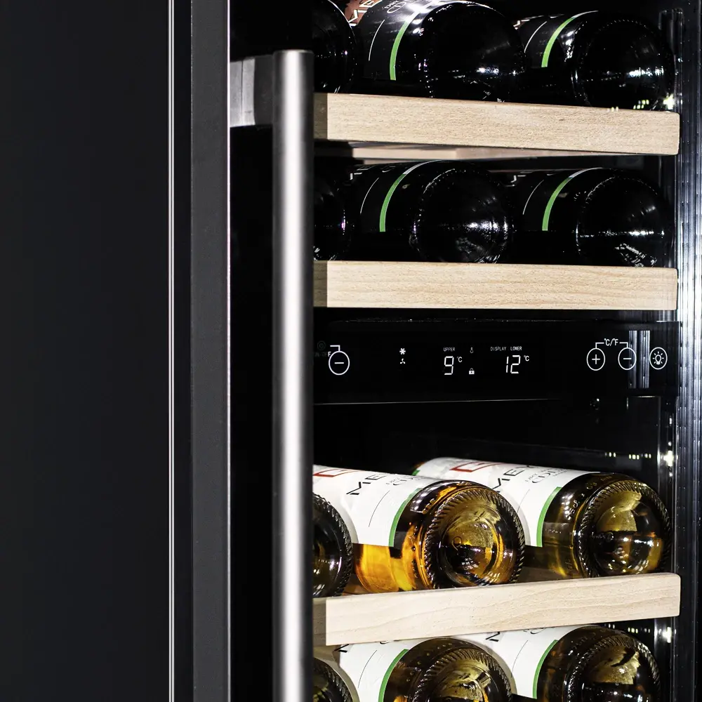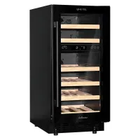Компрессорный винный шкаф обладает большой вместимостью и даёт возможность разместить до 28 бутылок стандартного типа Бордо (0,75 л). Располагаются они на выдвижных полках из дерева. Внутреннее пространство шкафа разделено на 2 температурные зоны, с возможностью настраивать каждую из них. Общий диапазон температуры у данной модели от +5°C до +20°C.