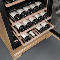 Винный холодильник оснащен дверью с защитой от ультрафиолетовых лучей и отлично подойдет для хранения и созревания различных сортов вин. Динамическая система охлаждения обеспечивает оптимальную температуру для вина и сохраняет необходимую влажность внутри камеры.