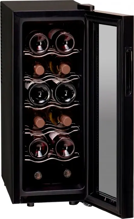 Холодильник вмещает до 12 бутылок вина объемом 0,75 л