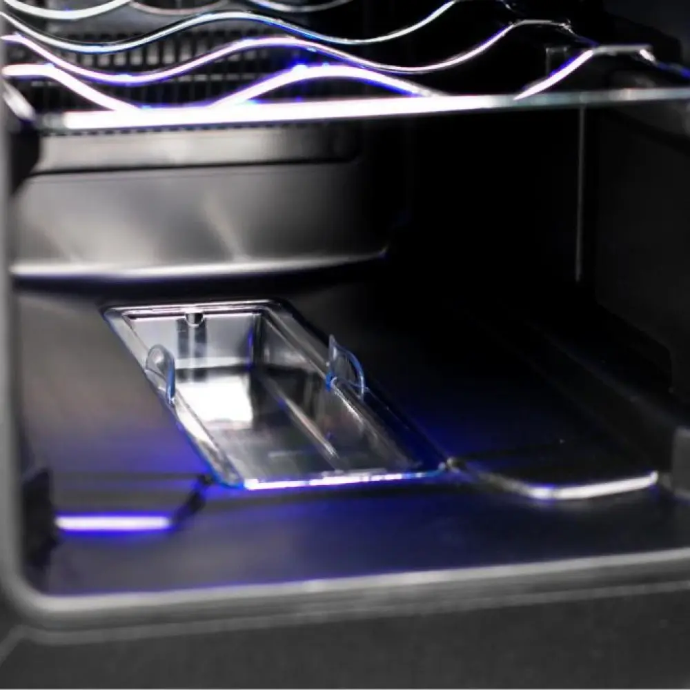 Двойное стекло с защитой от прямых УФ-лучей поддерживает качественные условия хранения вина. Для размещения винных бутылок, шкаф оснащен 3 полками из хромированного металла.