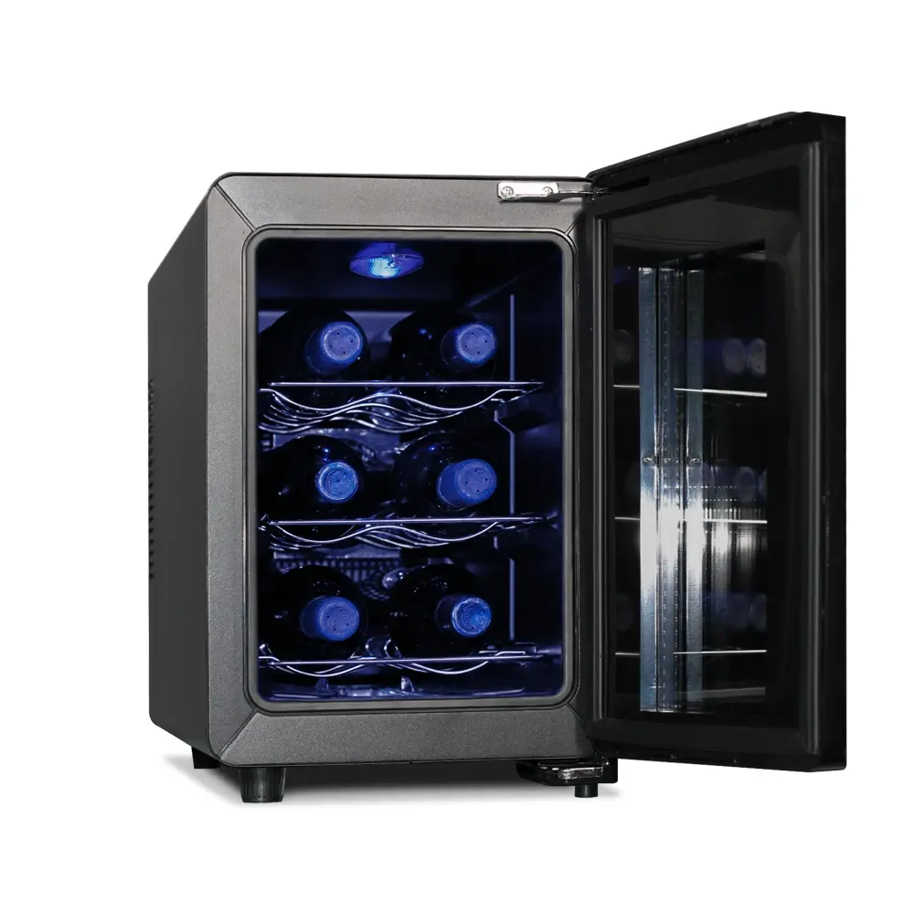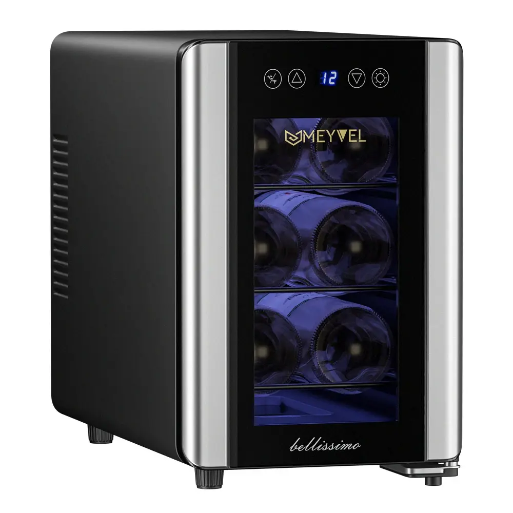 Термоэлектрический винный шкаф Meyvel MV06-BSF1 (easy) обладает небольшой вместимостью и способен разместить в себе до 6 бутылок. Внутреннее пространство шкафа имеет одну температурную зону, с возможностью настраивать её от +8 °C до +18 °C. В нижней части винного шкафа установлен съемный резервуар для воды, который предназначен для эффективного поддержания уровня влажности в 50-80%.